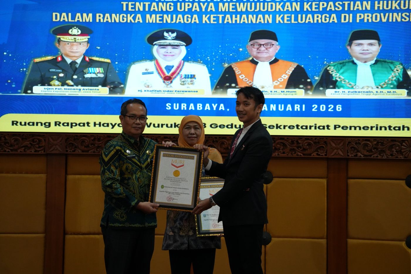 Kegiatan tersebut dihadiri oleh Gubernur Jawa Timur Khofifah Indar Parawansa, Kepala Kepolisian Daerah Jawa Timur Irjen Pol. Nanang Avianto, Ketua Muda Mahkamah Agung Republik Indonesia Dr. H. Yasardin, S.H., M.H., serta Direktur Jenderal Badan Peradilan Agama Mahkamah Agung Republik Indonesia Drs. Muchlis, S.H., M.H. Turut hadir Ketua Pengadilan Tinggi Agama Surabaya Dr. H. Zulkarnain, S.H., M.H. Acara ini juga diikuti oleh para Hakim Tinggi serta seluruh Ketua, Panitera, dan Sekretaris Pengadilan Agama se-Jawa Timur. Kehadiran para pimpinan dan aparatur peradilan tersebut menunjukkan komitmen bersama dalam mendukung ketahanan keluarga melalui kepastian hukum.