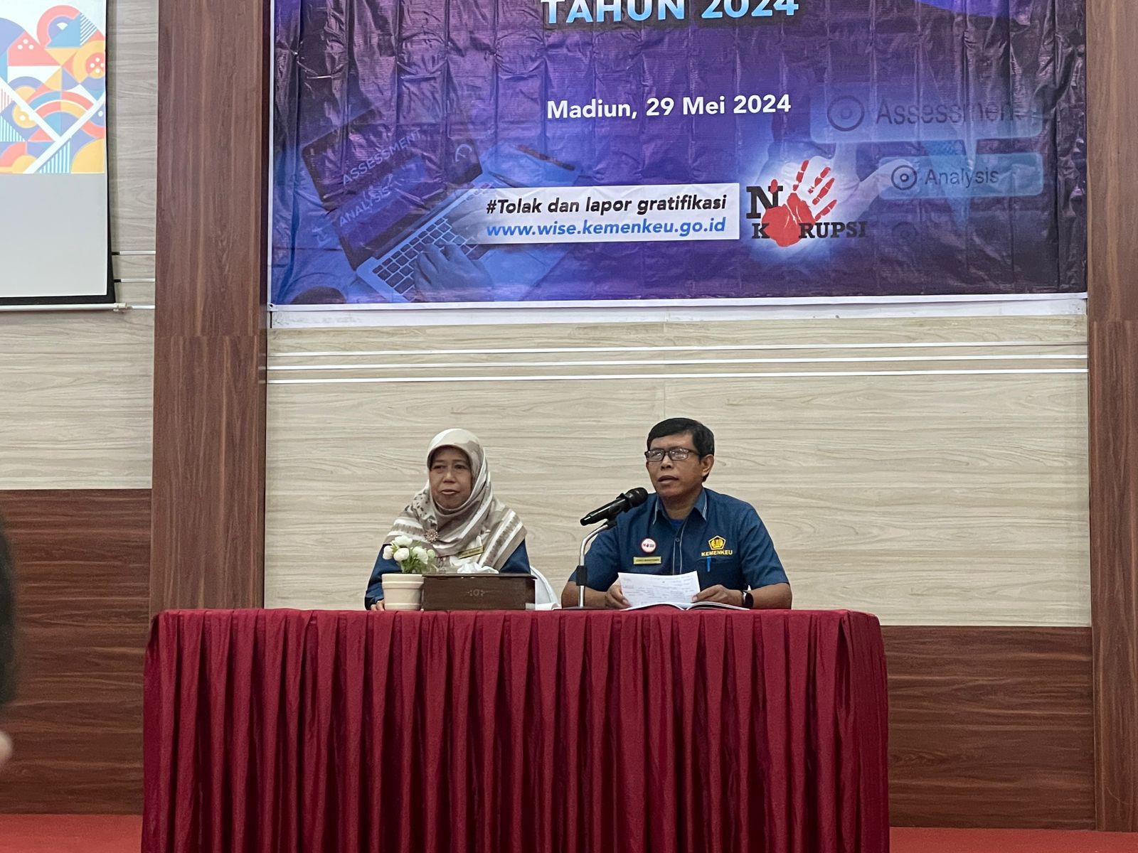 Acara diawali dengan menyanyikan lagu Indonesia Raya dan pembacaan do’a, yang kemudian dilanjutkan dengan sambutan dari Bapak Joko Maryono (Kepala KPPN Madiun). Dalam sambutannya beliau menyampaikan bahwa ada sedikit perubahan penilaian IKPA di tahun 2024 ini, dari 8 indikator penilaian sebelumnya terdapat 5 indikator yang mengalami perubahan formulasi. Beliau mengapresiasi satker Dimana Sebagian besar satuan kerja dilingkup KPPN Madiun telah mendapat nilai IKPA diatas 95, dengan adanya perubahan ini setiap satker diharapkan dapat segera move on dari formula yang lama dan mulai beradaptasi dengan formula yang baru sehingga nilai IKPAnya menjadi maksimal. Dalam sambutannya beliau juga menegaskan bahwa para undangan berada di Zona Integritas, selanjutnya Beliau menghimbau untuk melaporkan setiap tindakan yang mengarah pada gratifikasi terhadap layanan yang diberikan oleh KPPN Madiun.
