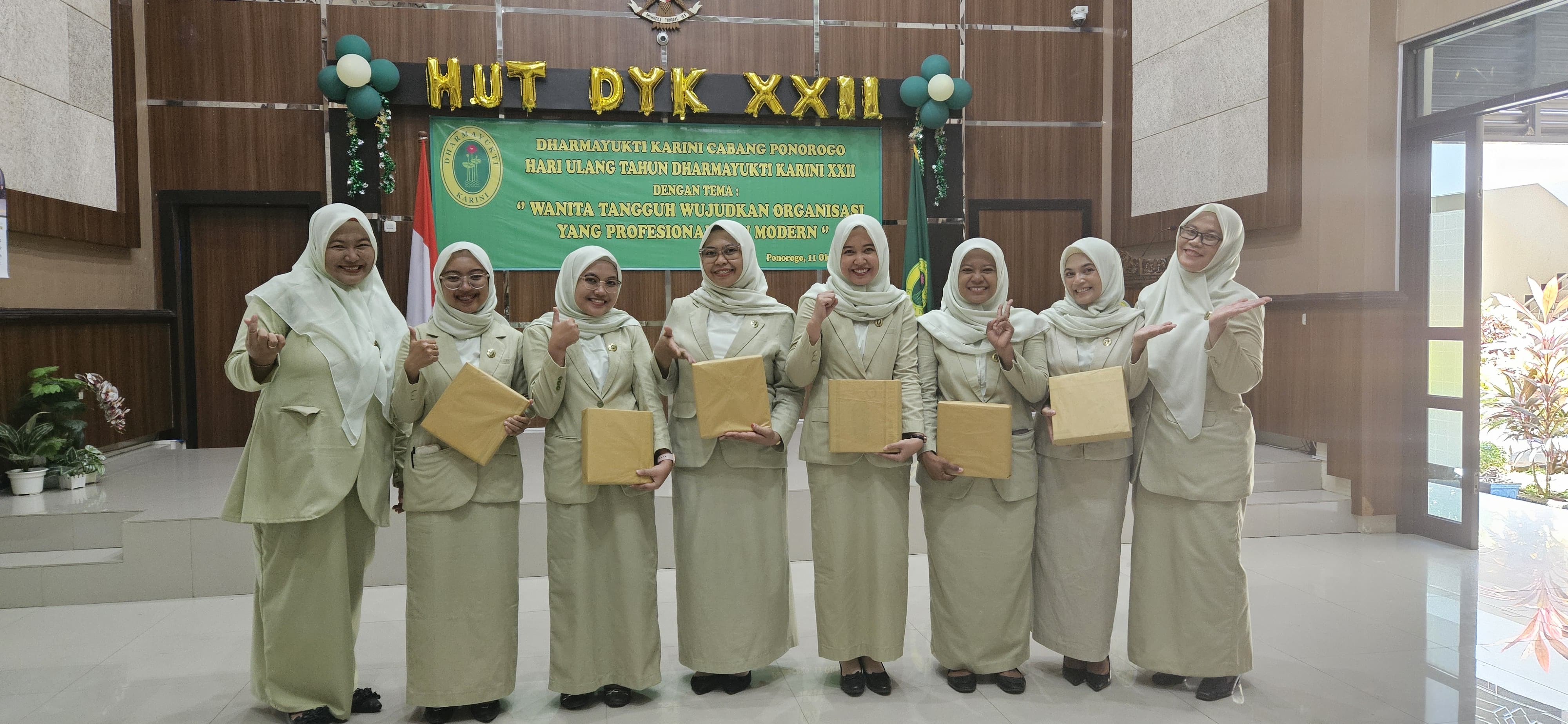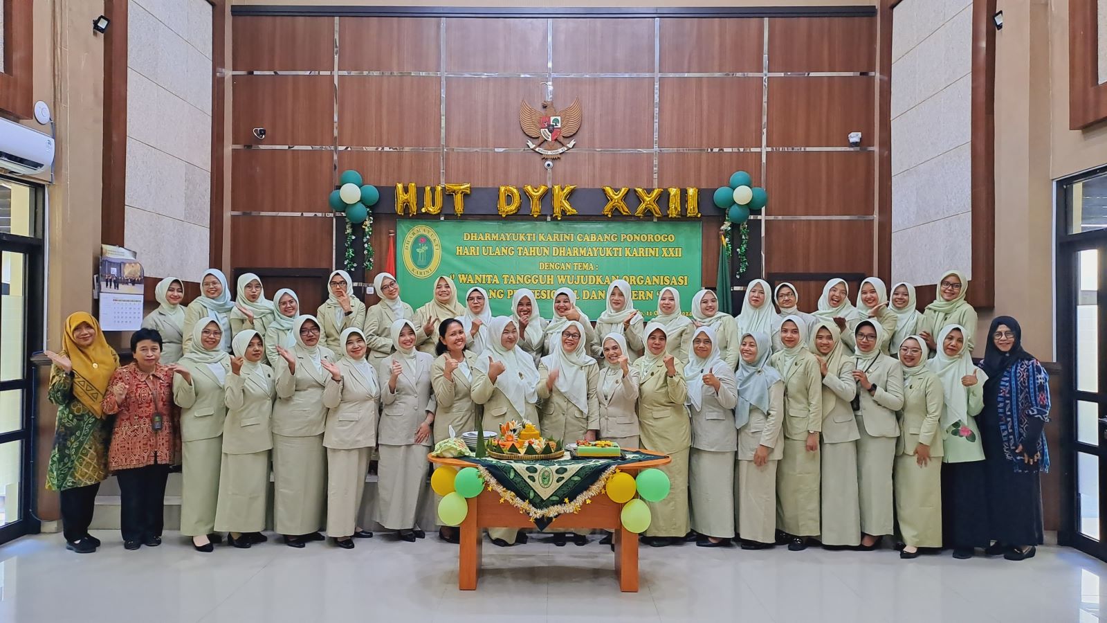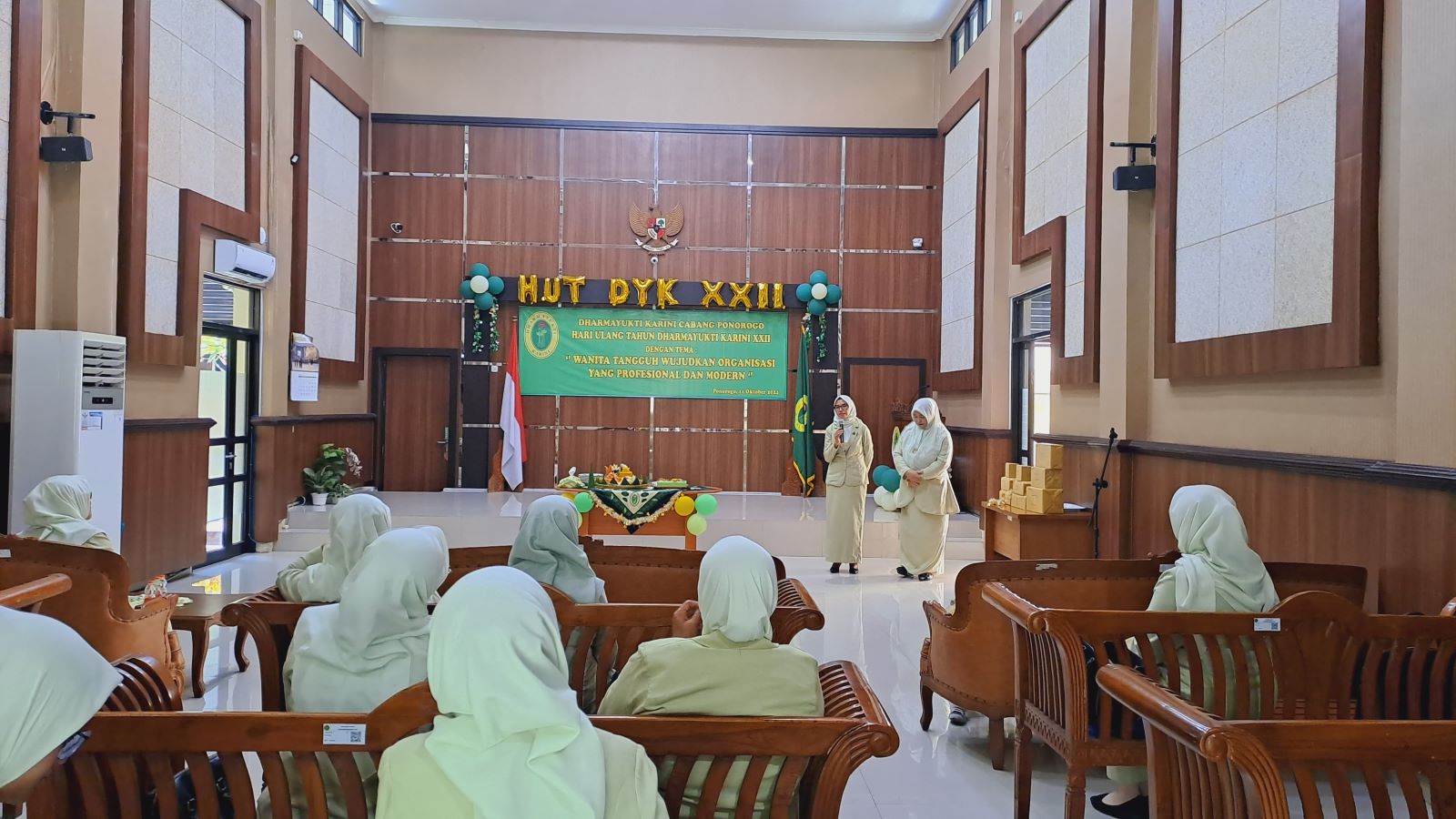 Adapun peringatan HUT Dharmayukti Karini Ke-XXII dimulai dengan menyanyikan lagu Kebangsaan Indonesia Raya, menyanyikan lagu Hymne dan Mars Dharmayukti Karini, dan pembacaan Doa. Kemudian acara dilanjutkan dengan sambutan Ibu Ketua DYK Cabang Ponorogo, dalam sambutannya beliau menyampaikan sambutan tertulis dari Ibu Ketua Umum DYK. Pada kesempatan tersebut, Bapak Pelindung DYK Cabang Ponorogo, yaitu Ketua Pengadilan Negeri juga memberikan sambutannya, beliau menyampaikan bahwa menjadi ibu DYK tidak mesti memiliki gaya hidup yang mewah, dengan hidup sederhana juga dapat terlihat mewah dan modern, hal tersebut juga berkaitan dengan tema dari ulang tahun DYK ke XXII yakni“ Wanita Tangguh Wujudkan Organisasi Yang Profesional dan Modern”.
