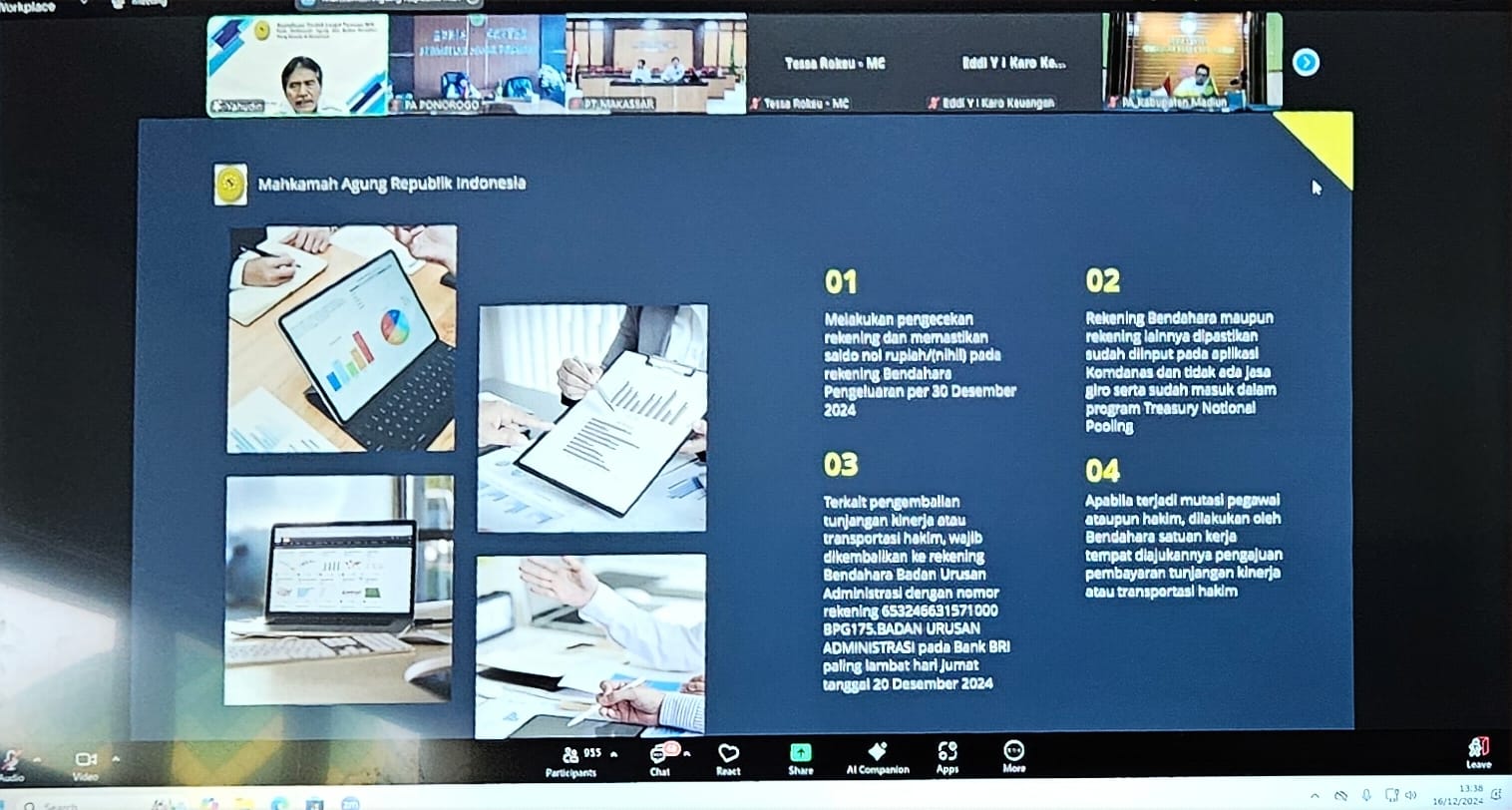 www.pa-ponorogo.go.id || Senin, 16 Desember 2024 Bertempat di Ruang Media Center Pengadilan Agama Ponorogo St. Mar’atu Ulfah, S.Ag selaku sekretaris dan Kuasa Pengguna Anggaran serta di dampingi oleh tim pengelola keuangan Pengdilan Agama Ponorogo mengikuti Sosialisasi Langkah – Langkah Akhir Tahun Anggaran 2024 dan Persiapan Awal Tahun Anggaran 2025. Kegiatan ini berdasarkan pada undangan dari Badan Urusan Administrasi Mahkamah Agung RI No. 2167/BUA.3/UND.KU1.1/XII/2024 tanggal 13 Desember 2024. Kegiatan dilaksanakan secara daring dan di ikuti oleh seluruh satuan kerja di bahwah Mahkamah Agung Republik Indonesia.