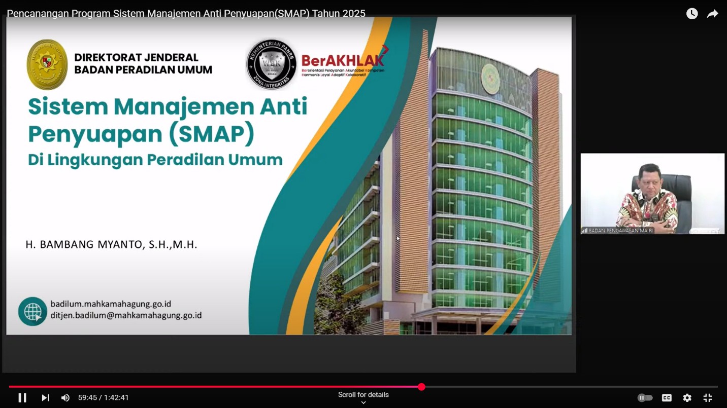 www.pa-ponorogo.go.id || Rabu, 5 Maret 2025. Sehubungan dengan Surat Plt. Kepala Badan Pengawasan Mahkamah Agung Republik Iindonesia nomor 9-SMAP-01/BP/PW1/l/2025 tentang Undangan Pencanangan Sistem Manajemen Anti Penyuapan (SMAP), telah diadakan Pencanangan Program Sistem Manajemen Anti Penyuapan (SMAP) 2025 di lingkungan peradilan umum yang disiarkan secara daring melalui kanal Youtube Mahkamah Agung RI. Kegiatan tersebut ditujukan kepada kepada seluruh satuan kerja pengadilan di seluruh Indonesia. Bertempat di Ruang Media Center Pengadilan Agama Ponorogo, Wakil Ketua, jajaran Hakim, Panitera dan Sekretaris Pengadilan Agama Ponorogo pun mengikuti jalannya kegiatan tersebut yang disiarkan secara langsung dari Ruang Media Center Badan Pengawasan MA RI.