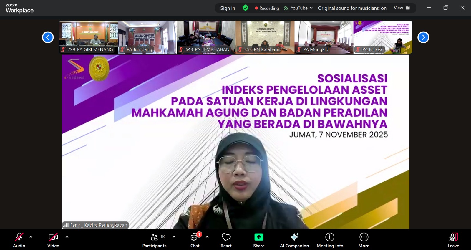 www.pa-ponorogo.go.id | Jumat, 07 November 2025. Berdasarkan surat dari Badan Urusan Administrasi Mahkamah Agung RI Nomor 638/BUA.4/UND.PL1.2/XI/2025 Pengadilan Agama Ponorogo mengikuti Sosialisasi Indeks Pengelolaan Aset secara daring melalui zoom meeting. Dalam kegiatan ini diwakili oleh 1 orang pegawai PA Ponorogo yaitu Franky Rifai Putra, S.H. Sosialisasi ini menekankan pentingnya menjunjung tinggi prinsip tata kelola pemerintahan yang baik (good governance), diperlukan pengelolaan Barang Milik Negara secara tepat, efektif, dan optimal penyelenggaraan tugas dan fungsi.
