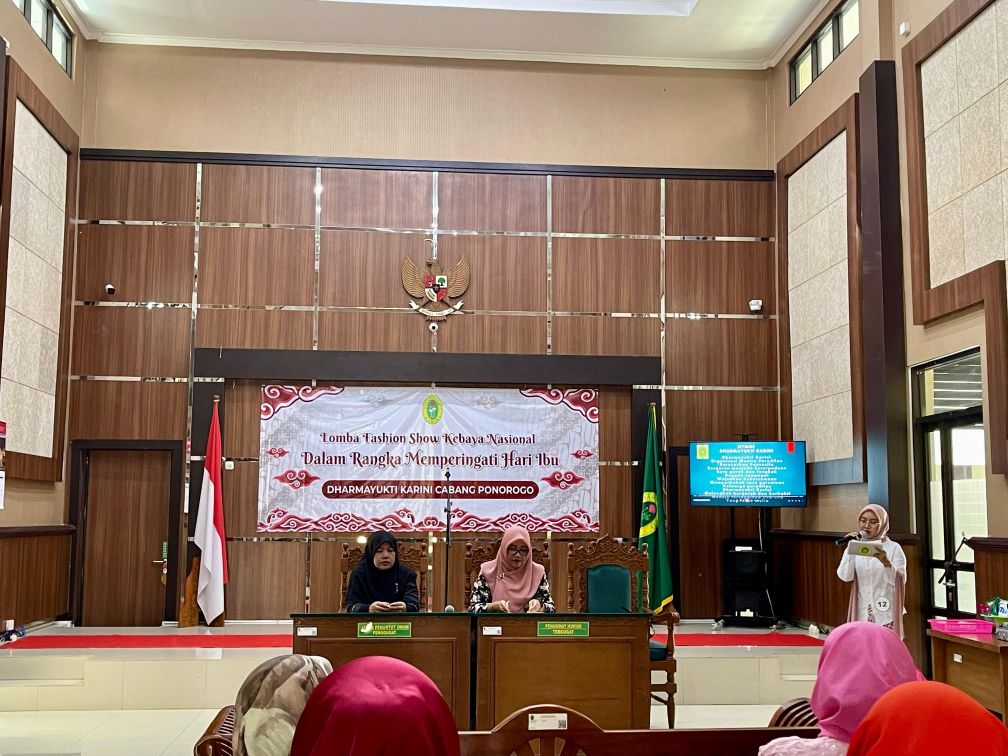 www.pa-ponorogo.go.id || Jum’at, 12 Desember 2025 Dharmayukti Karini Cabang Ponorogo menyelenggarakan acara peringatan Hari Ibu dengan Lomba Fashion Show Kebaya Nasional. Kegiatan ini diikuti oleh anggota Dharmayukti Karini yang terdiri dari pegawai wanita serta istri pegawai Pengadilan Negeri dan Pengadilan Agama Ponorogo. Acara tersebut menjadi momentum untuk mempererat silaturahmi antaranggota. Selain itu, kegiatan ini juga bertujuan untuk menumbuhkan semangat kebersamaan dan penghargaan terhadap peran ibu.
