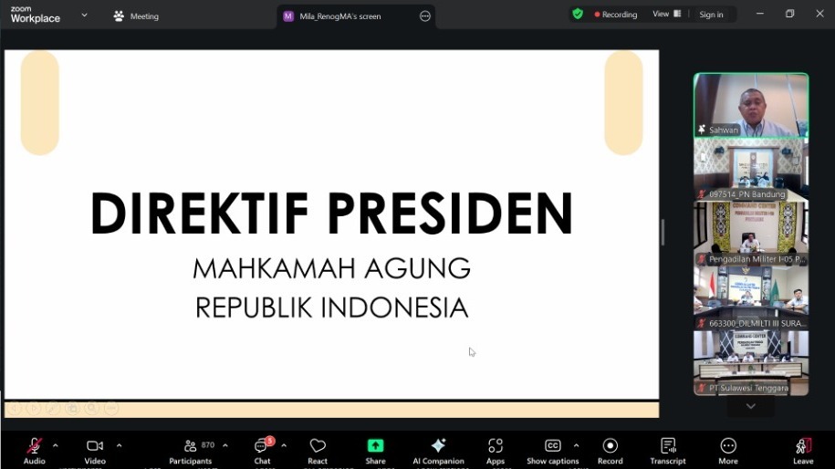 www.pa-ponorogo.go.id || Senin, 15/12/2025 Bertempat di ruang sekretaris, St. Mar’atu Ulfah (Sekretaris Pengadilan Agama Ponorogo) mengikuti rapat koordinasi yang diselenggarakan oleh Badan Urusan Administrasi Mahkamah Agung Republik Indonesia berdasarkan surat undangan Nomor 356/BUA.1/UND/RA1.8/XII/2025. Kegiatan tersebut dilaksanakan secara daring melalui Zoom Meeting dan diikuti oleh seluruh satuan kerja di bawah Mahkamah Agung RI. Rapat koordinasi ini bertujuan untuk penguatan dukungan pelaksanaan prioritas direktif Presiden Tahun Anggaran 2026.