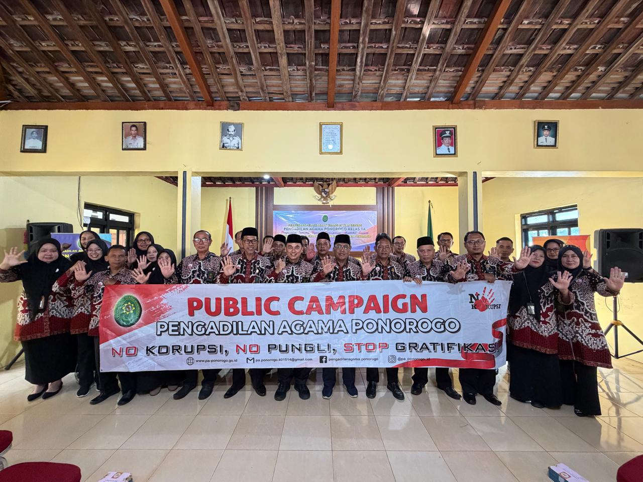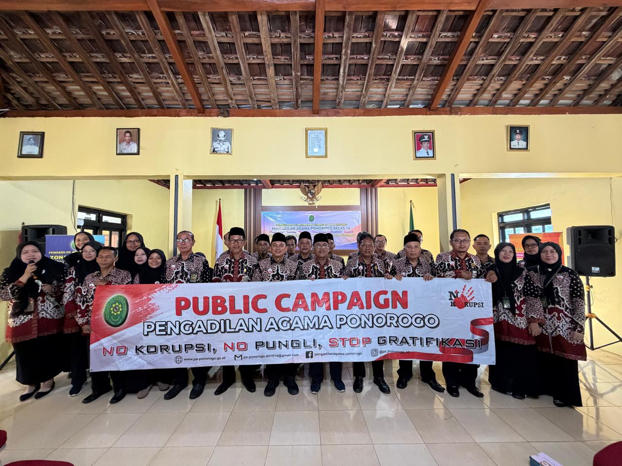 Public Campaign dilaksanakan Pukul. 08.50 WIB, sekaligus pengenalan dan telaah terhadap implementasi inovasi pelayanan dan inovasi berbasis aplikasi. Acara dibuka dengan penyataan sikap seluruh aparatur PA Ponorogo yang dibacakan oleh Ketua PA Ponorogo dan diikuti oleh seluruh hakim dan pegawai PA Ponorogo. Kegiatan public campaign PA Ponorogo bermaksud menyebarluaskan kepada khalayak ramai tentang Pembangunan Zona Integritas Menuju Wilayah Bebas dari Korupsi (WBK) dan Wilayah Birokrasi Bersih dan Melayani (WBBM). Kegiatan tersebut juga merupakan salah satu program kerja dari agen perubahan Pengadilan Agama Ponorogo dalam menginternalisasikan semangat anti korupsi kepada para pegawai dan juga mengkampanyekan semangat anti korupsi kepada seluruh masyarakat.