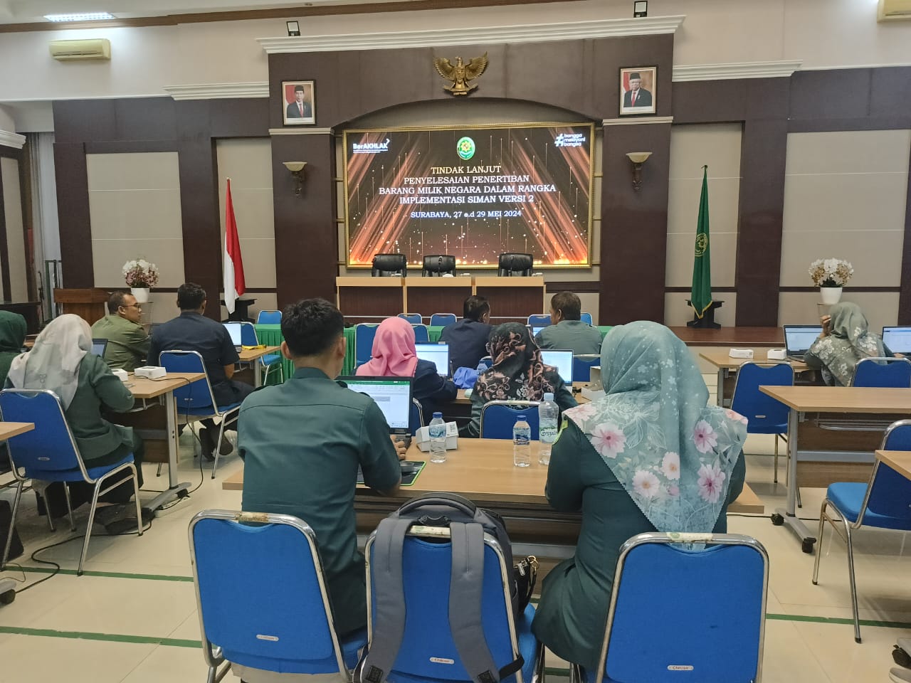 www.pa-ponorogo.go.id || Selasa, 28/05/2024. Berdasarkan Surat Undangan dari Sekretaris Pengadilan Tinggi Surabaya Nomor : 3068/SEK.W14-U/PL1.2.5/5/2024, Plh. Kasubbag Umum dan Keuangan Yenni Lestri, S.Kom, dan Operator BMN PA Ponorogo Bambang Kusbandono, A.Md menghadiri Tindak Lanjut Penyelesaian Penertiban BMN Dalam Rangka Implementasi SIMAN V2 yang digelar di Aula Lantai 3 Pengadilan Tinggi Surabaya. Kegiatan dimulai Pukul 10.00 WIB dan diikuti oleh 79 (tujuh puluh sembilan) Satuan Kerja Koordinator Wilayah (DIPA 01) Jawa Timur. Kegiatan tersebut dilaksanakan sebagai tindak lanjut Surat Kepala Biro Perlengkapan Mahkamah Agung RI Nomor 62/BUA.4/PL1.2/V/2024 tanggal 15 Mei 2024 perihal Tindak Lanjut Penyelesaian Penertiban BMN Dalam Rangka Implementasi SIMAN V2.