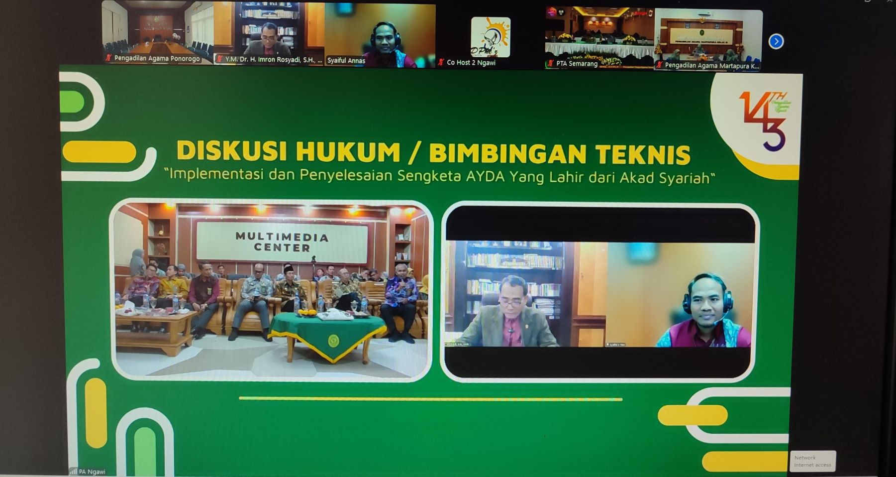 www.pa-ponorogo.go.id || Pada Tanggal 17 Januari 2025, Wakil Ketua PA Ponorogo Ponorogo yaitu H. Mahrus, Lc., M.H. beserta Panitera Widodo Suparjiyanto, S.HI., M.H. dan Sekretaris St. Mar’atu Ulfah, S.Ag., menghadiri kegiatan Bimbingan Teknis Peningkatan Peradilan Agama dengan Nomor Surat 169/KPA.W13-A25/UND.HM2.1.1/I2025 tanggal 13 Januari 2025. Kegiatan bertempat di Multimedia Center PA Ngawi dalam rangka peringatan hari ulang tahun PA Ngawi ke 143 tahun. Dalam rangka peningkatkan kualitas dan kapasitas tenaga teknis di lingkungan peradilan agama dalam permasalahan teknis yustisial Peradilan Agama terkait kegiatan Bimbingan Teknis di Lingkungan Peradilan Agama yang secara langsung / hybird dengan tema “Implementasi dan Penyelesaian Sengketa AYDA yang lahir dari Akad Syariahi”, sebagai narasumber Yang Mulia Hakim Agung Kamar Agama Mahkamah Agung Republik Indonesia, Bapak Dr. H. Imron Rosyadi, S.H., M.H.