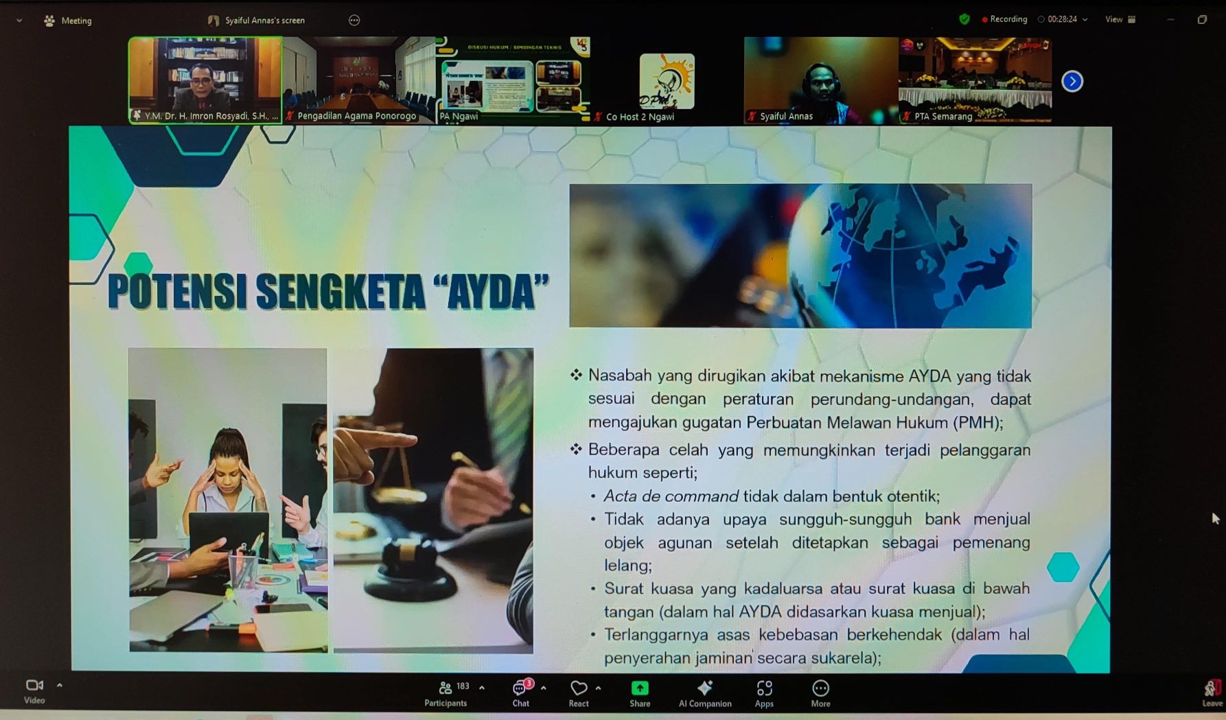 Acara tersebut di awali menyanyikan Lagu Indonesia Raya dan dilanjutkan dengan lagu Hymne MA RI dan diteruskan dengan pembacaan Do'a. Bimtek dimoderatori oleh Syaiful Annas, S.HI., M.Sy. (Hakim Yustisial MA RI). Pada kesempatan kali ini yakni narasumber Yang Mulia Hakim Agung Kamar Agama MA RI Dr. H. Imron Rosyadi, S.H., M.H..,tak lupa juga menyampaikan terima kasih kepada para undangan yang telah hadir memenuhi undangan. Dalam kegiatan narasumber menyampaikan materi Implementasi dan Penyelesaian Sengketa AYDA pada Peradilan Agama. Dalam proses peradilan terkait khususnya Pasal 1 angka 24 Peraturan Bank Indonesia No. 9/9/PBI/2007 Jo. Peraturan Bank Indonesia No. 8/21/PBI/2006 tentang Penilaian Kualitas Aktiva Bank Umum yang Melaksanakan Kegiatan Usaha Berdasarkan Prinsip Syariah, yang dimaksud dengan AYDA (Agunan Yang Diambil Alih) yakni “suatu aktiva yang diperoleh Bank, baik melalui pelelangan maupun di luar pelelangan berdasarkan penyerahan secara sukarela oleh pemilik agunan atau berdasarkan kuasa untuk menjual di luar lelang dari pemilik agunan/debitur dalam hal nasabah tidak memenuhi kewajibannya/lalai kepada bank.” Proses pengalihan terhadap barang-barang agunan dapat dilakukan melalui dua (2) cara yakni a) Melalui mekanisme lelang, b) Melalui mekanisme penjualan di bawah tangan dengan persetujuan dari pemilik agunan.